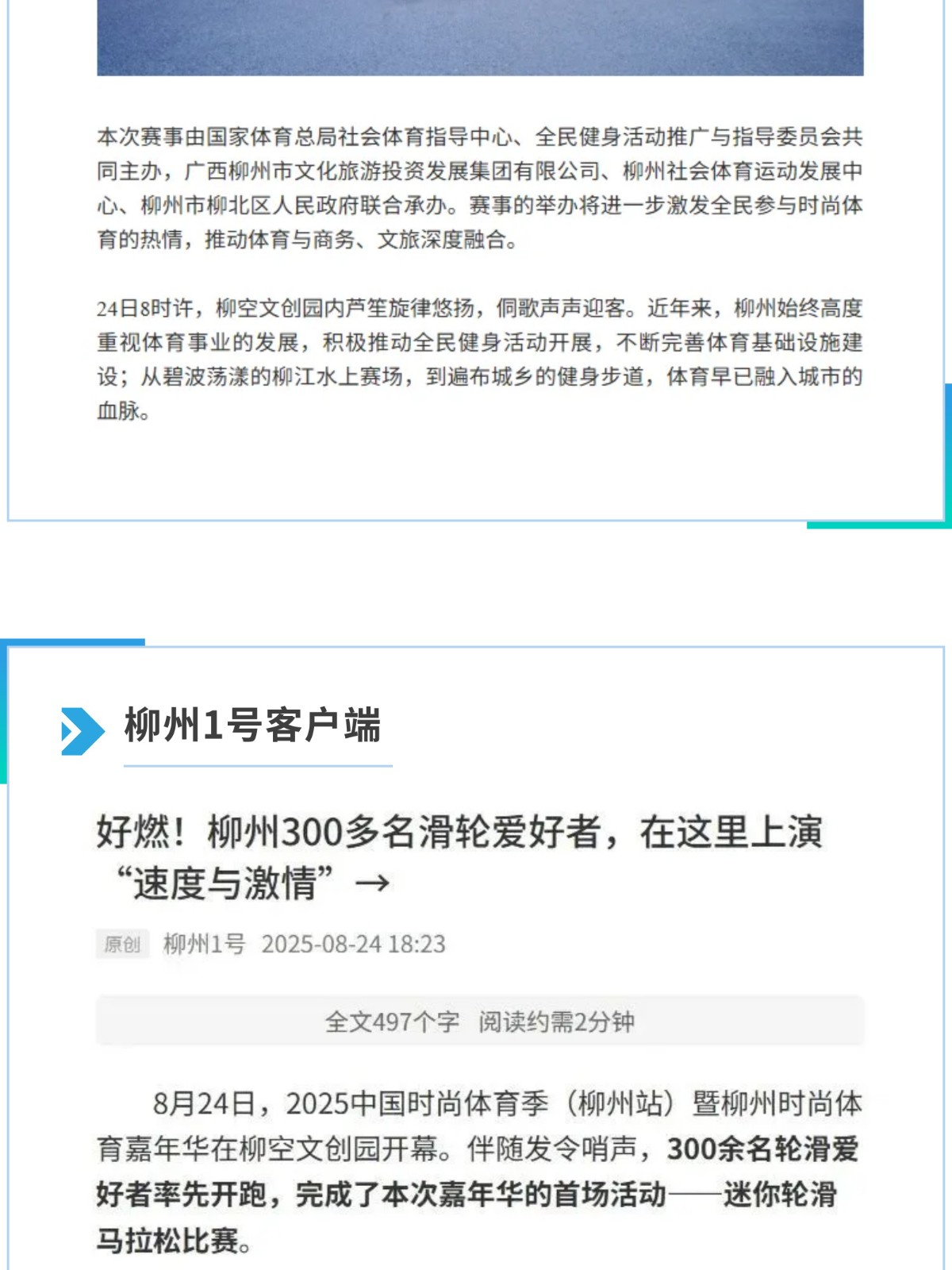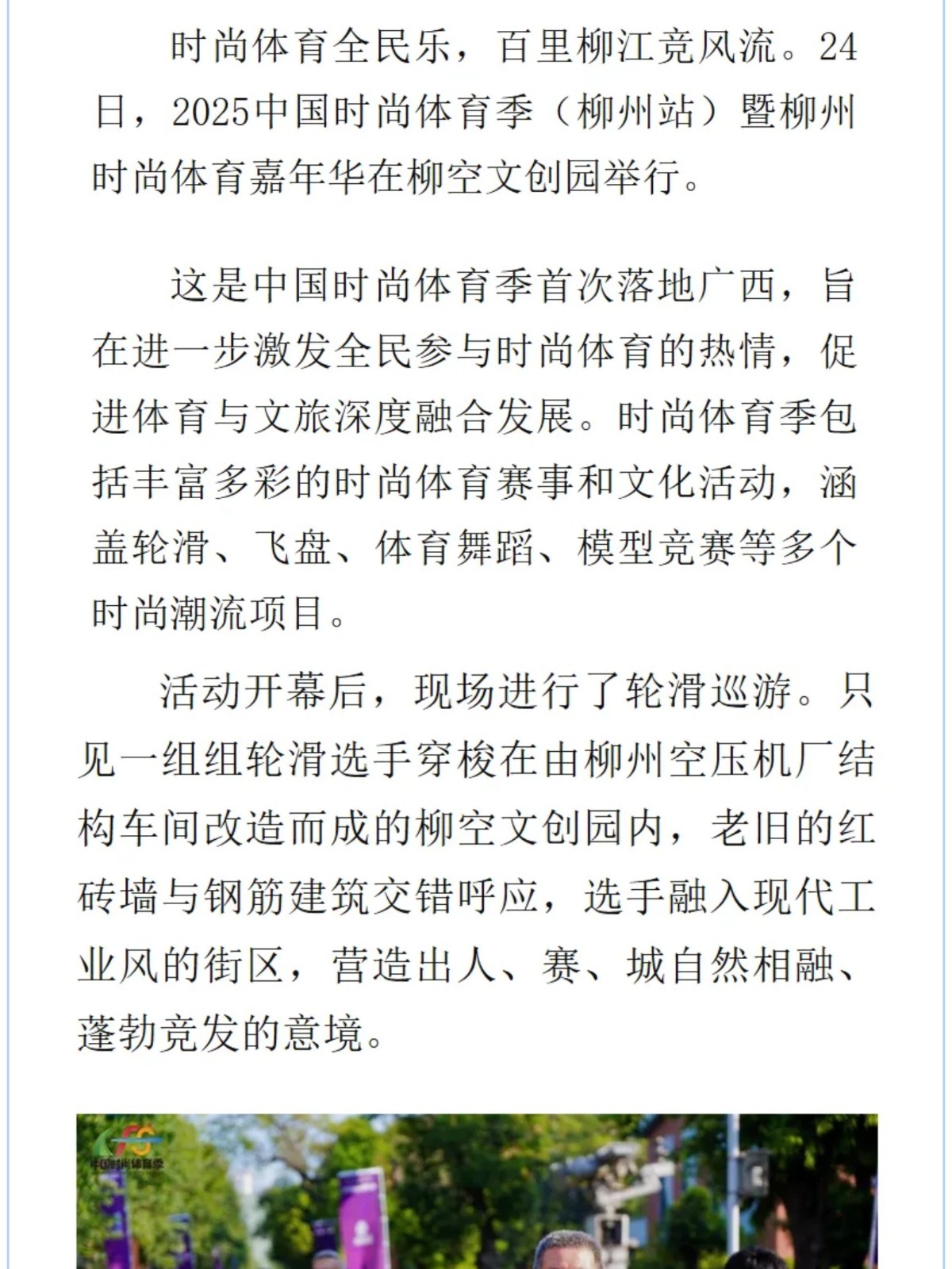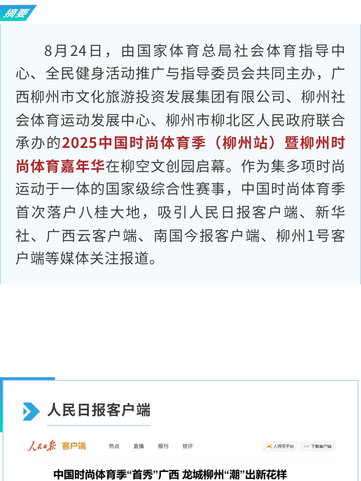 多家媒體關注:2025中國時尚體育季(柳州站)在柳空文創(chuàng)園啟動 發(fā)布時間:2025年08月29日 17時來源:本站原創(chuàng)瀏覽:124 人次