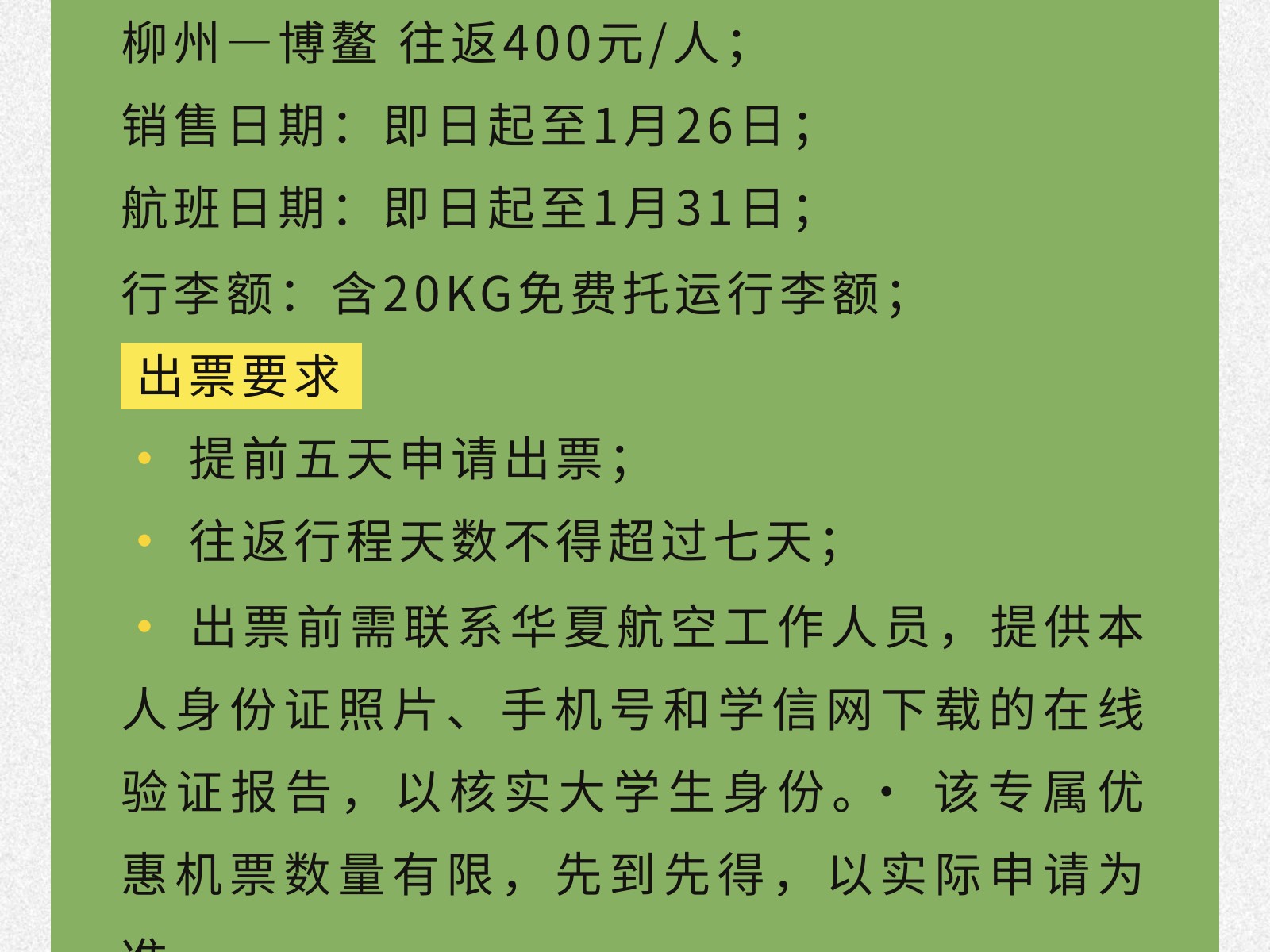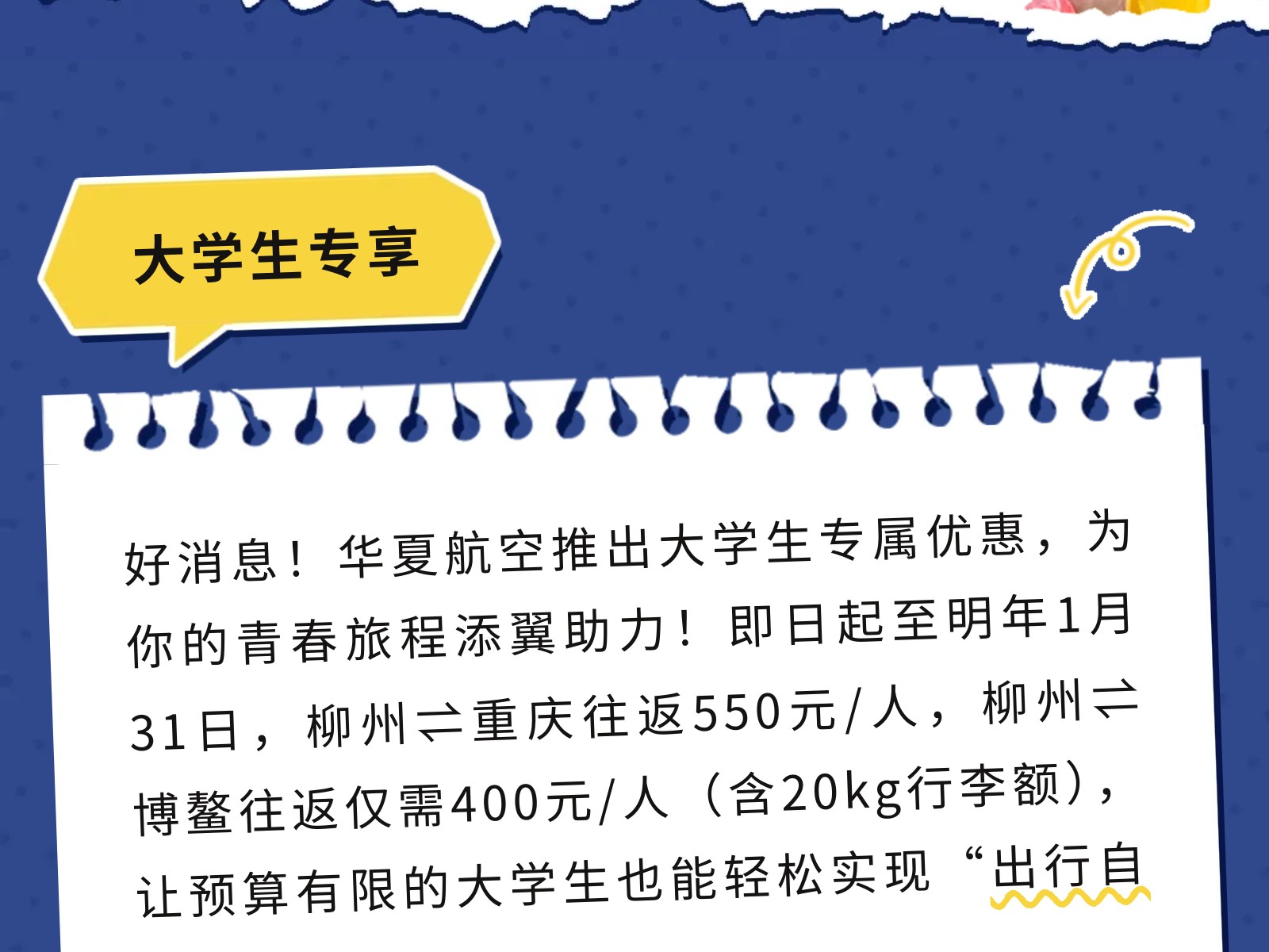 【青春專線】柳州?重慶/博鰲大學(xué)生機(jī)票來(lái)襲!雙向奔赴正當(dāng)時(shí) 發(fā)布時(shí)間:2025年12月02日 10時(shí)來(lái)源:本站原創(chuàng)瀏覽:105 人次