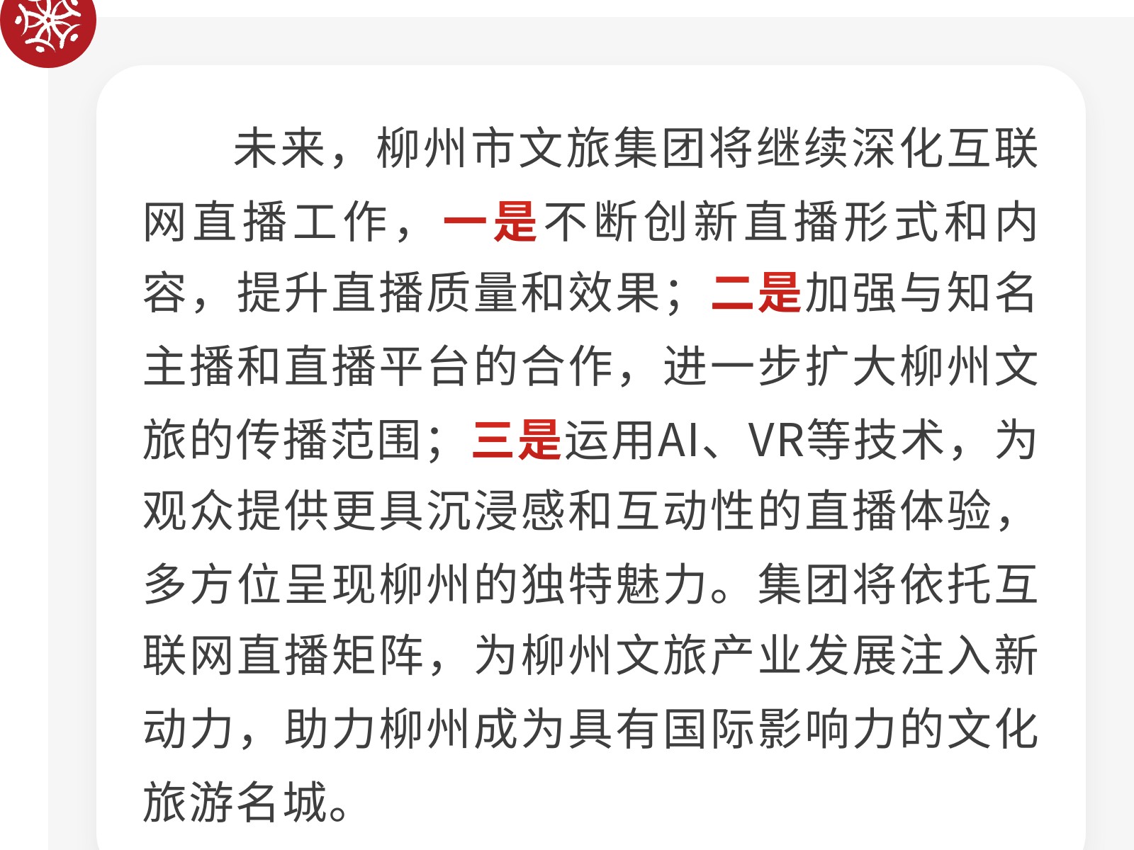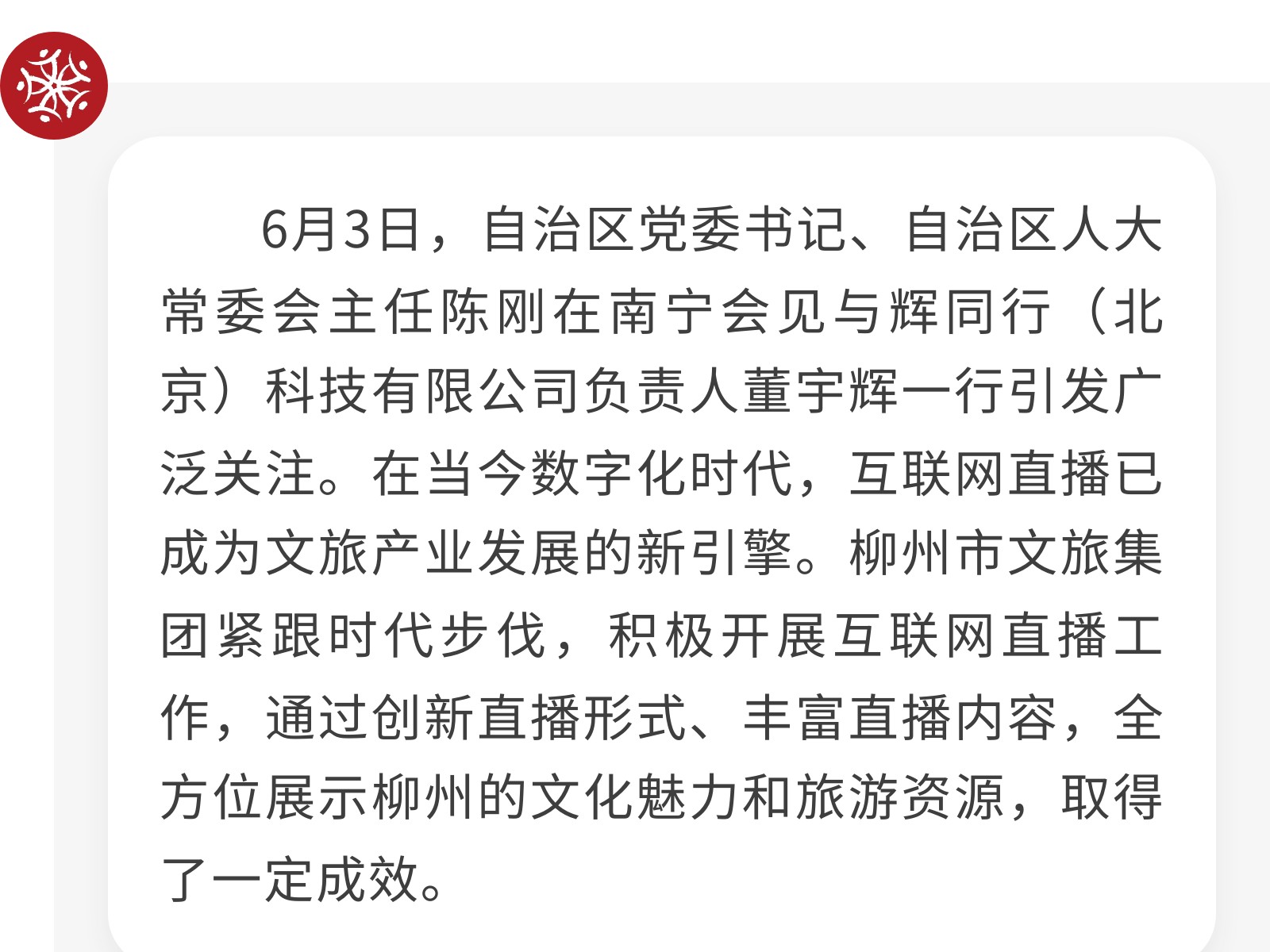 柳州市文旅集團(tuán)積極探索互聯(lián)網(wǎng)直播矩陣,助力城市文旅新發(fā)展 發(fā)布時間:2025年06月12日 20時來源:本站原創(chuàng)瀏覽:91 人次