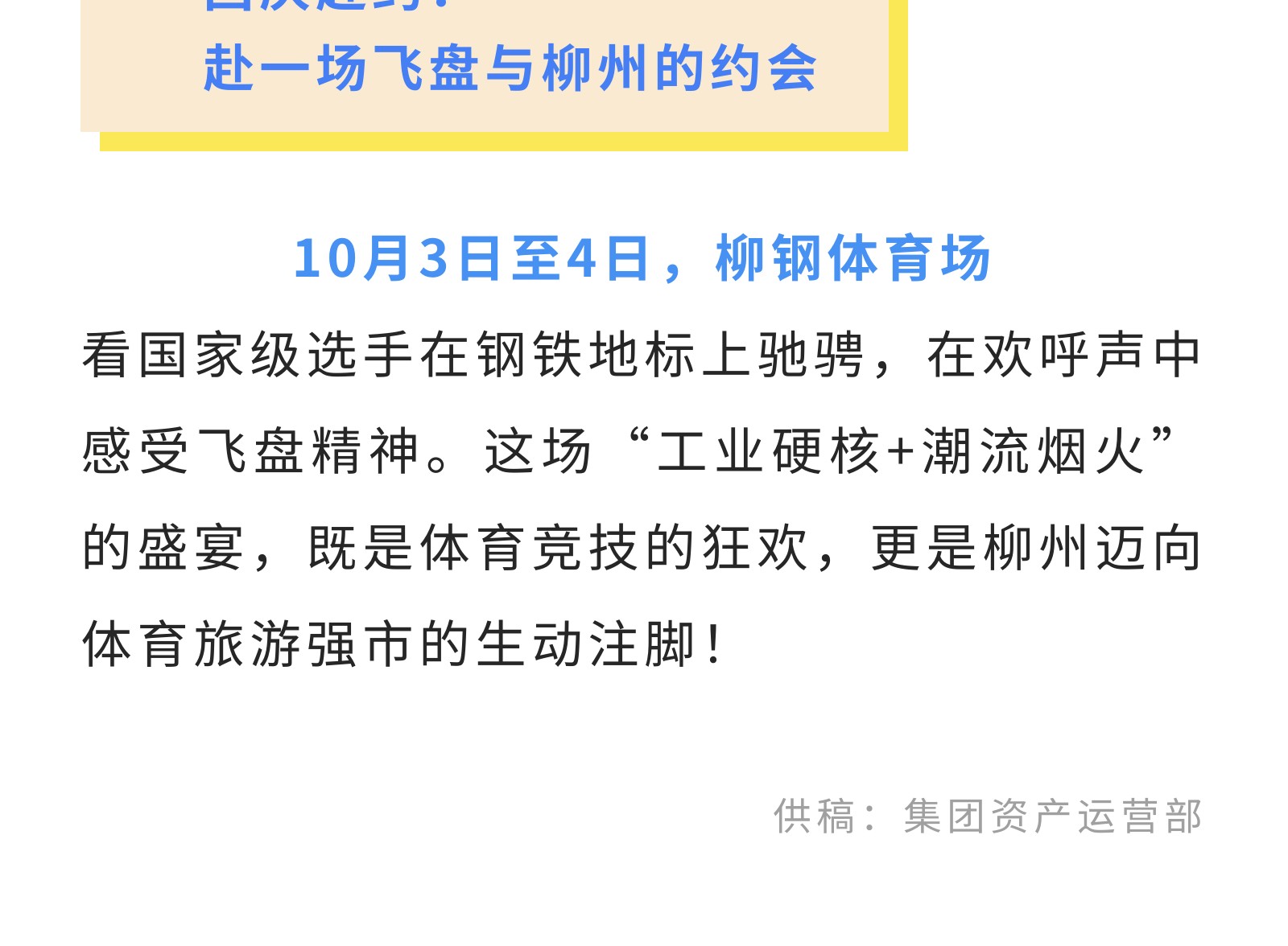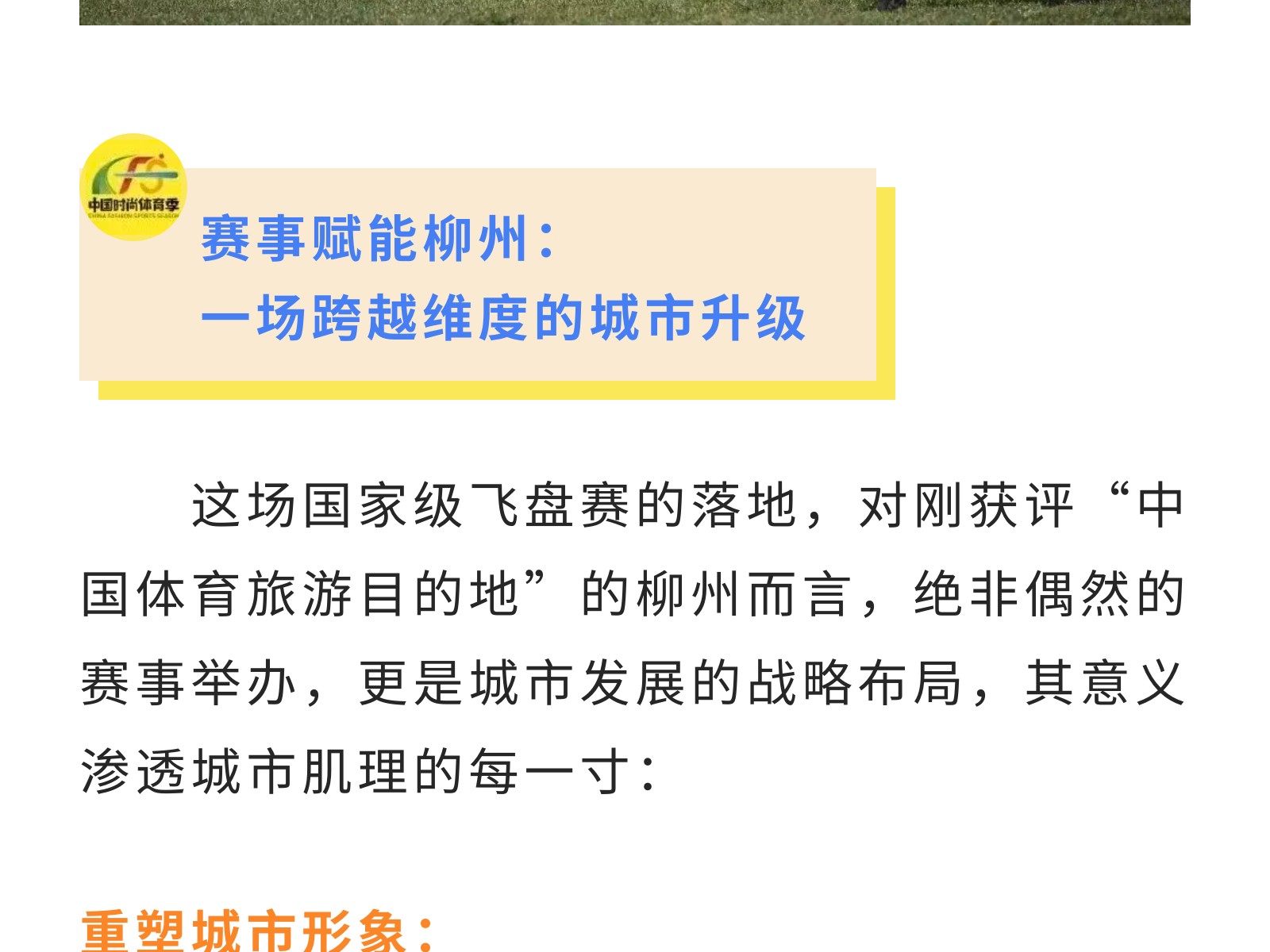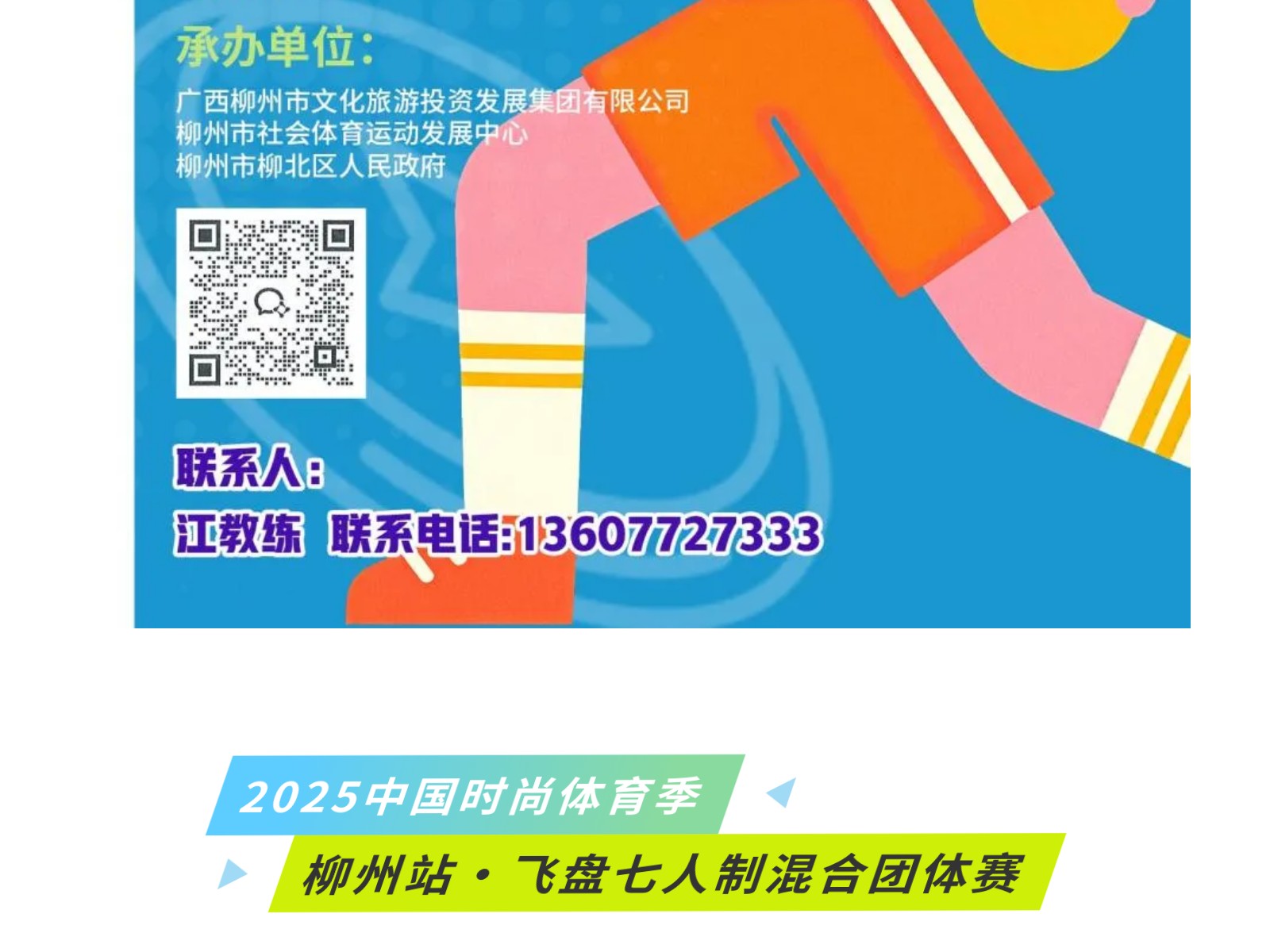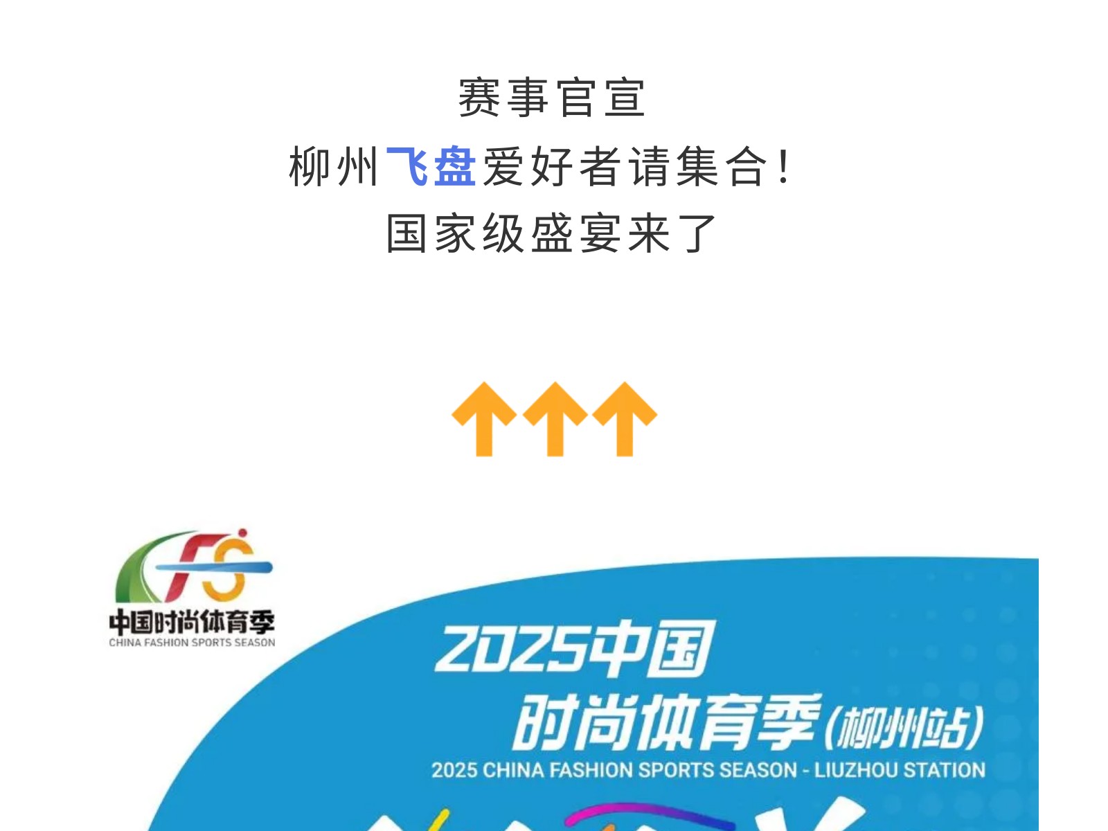 官宣!2025中國時(shí)尚體育季(柳州站)飛盤邀請(qǐng)賽來襲!10月3-4日燃情開幕! 發(fā)布時(shí)間:2025年09月27日 10時(shí)來源:本站原創(chuàng)瀏覽:50 人次