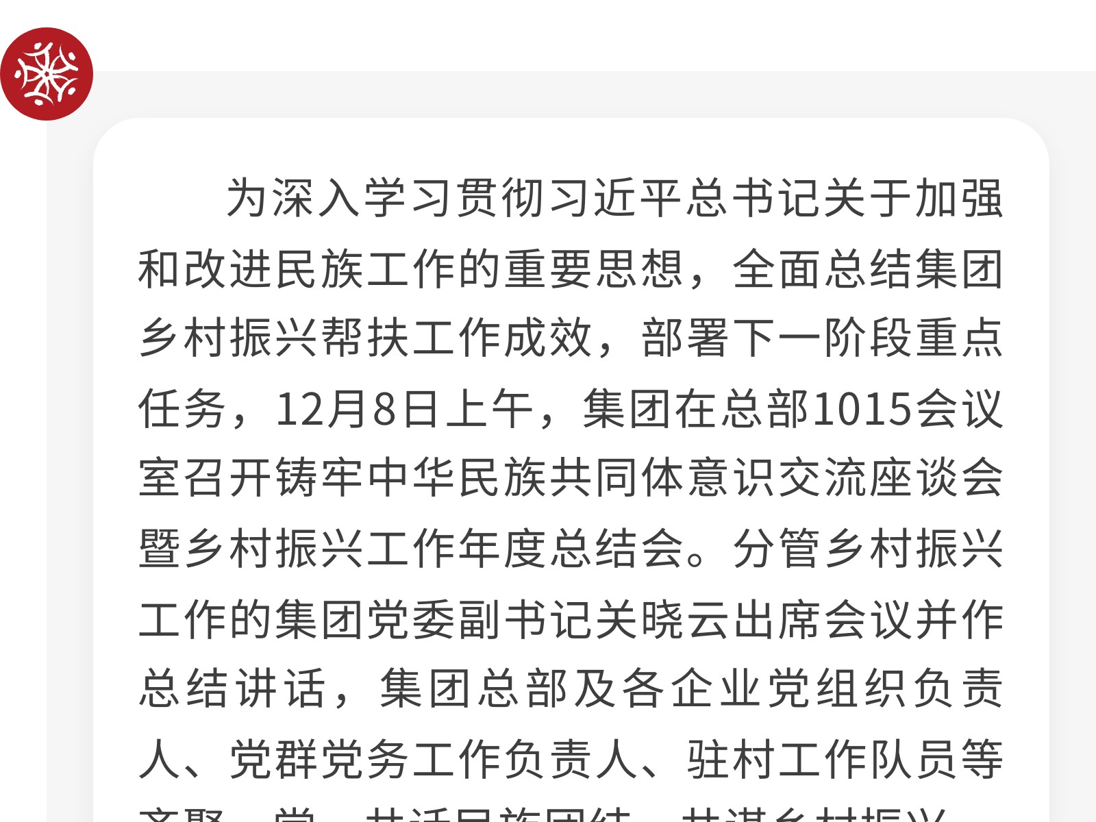 【凝心聚力共奮進(jìn) 民族團(tuán)結(jié)譜新篇】集團(tuán)召開鑄牢中華民族共同體意識交流座談會暨鄉(xiāng)村振興工作年度總結(jié)會 發(fā)布時間:2025年12月08日 10時來源:本站原創(chuàng)瀏覽:45 人次