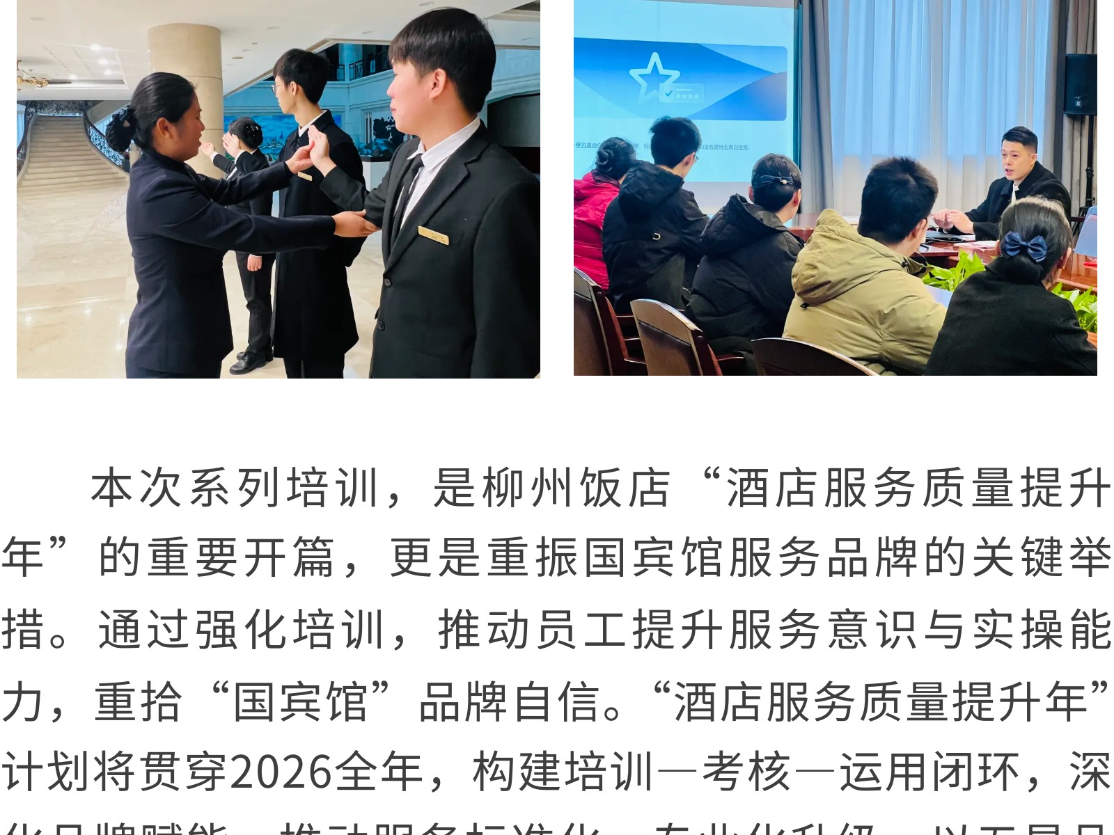 “柳飯學(xué)院”重磅啟班——首期酒店服務(wù)提升班開(kāi)課 以學(xué)促干鑄服務(wù)標(biāo)桿 發(fā)布時(shí)間:2026年02月13日 13時(shí)來(lái)源:本站原創(chuàng)瀏覽:40 人次